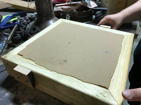 We placed the mold frame on a flat surface and then elevated the printed part on blocks of wood so that the centerline of the part was in the same plane as the dividing line of the two mold halves. Next we began to add the sand, sifting the first layer to ensure that it was free of chunks.