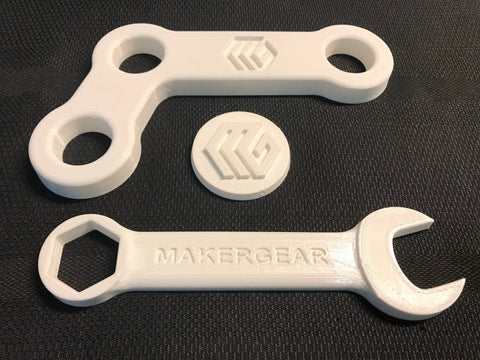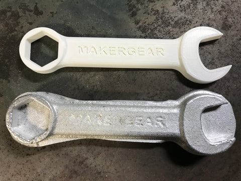 The wrench casting turned out fairly well also. The MakerGear logo is somewhat visible even though the most of the sand was removed from this feature when the printed part was taken out of the mold. Next time we'll make the letters thicker and with even more draft (currently 10 degrees). We still have some post-processing to do on this part.
