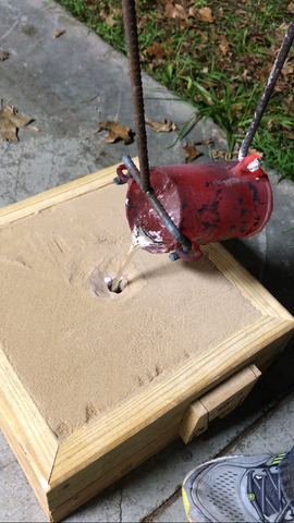 Time for the pour! We fired up our $70 furnace, which consisted of a 5 gallon bucket filled with fireproof concrete and powered by a propane tank.