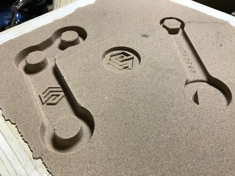 The wrench casting turned out fairly well also. The MakerGear logo is somewhat visible even though the most of the sand was removed from this feature when the printed part was taken out of the mold. Next time we'll make the letters thicker and with even more draft (currently 10 degrees). We still have some post-processing to do on this part.