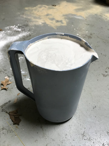 Our investment mixture was a 2:1 ratio of fine sand and plaster, with water added to until we got a yogurt-like texture. We placed the part in the bottom of a pitcher and poured in the investment.